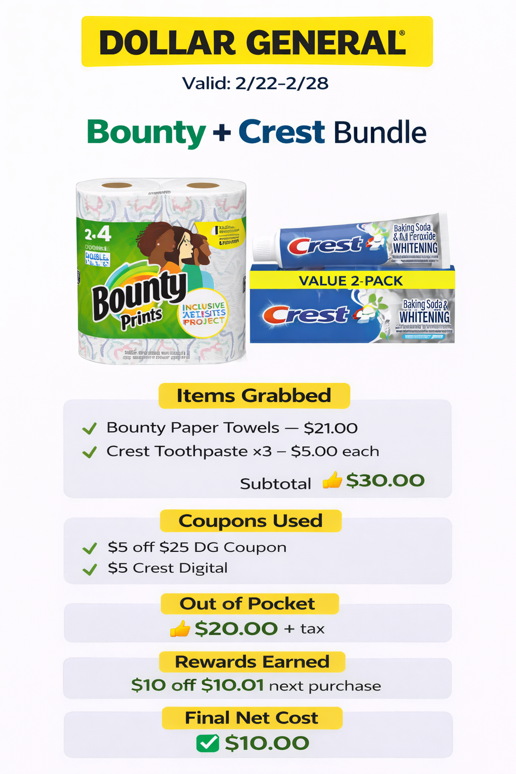 - Final Net Cost: $1.23 total → $0.62 each