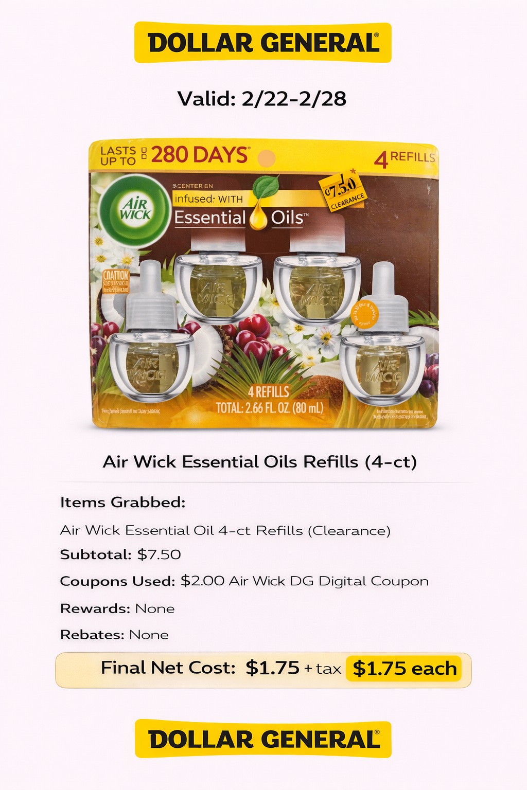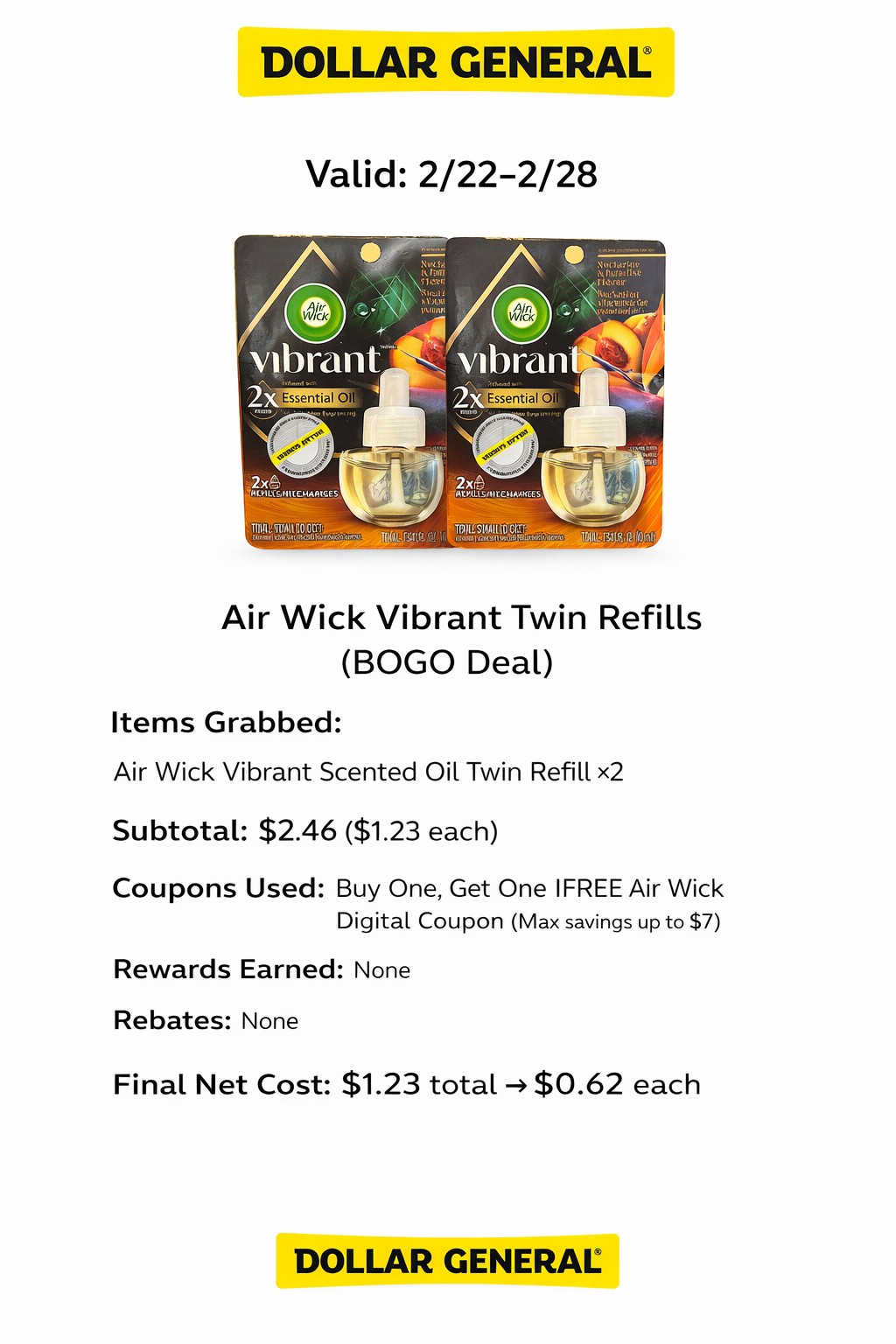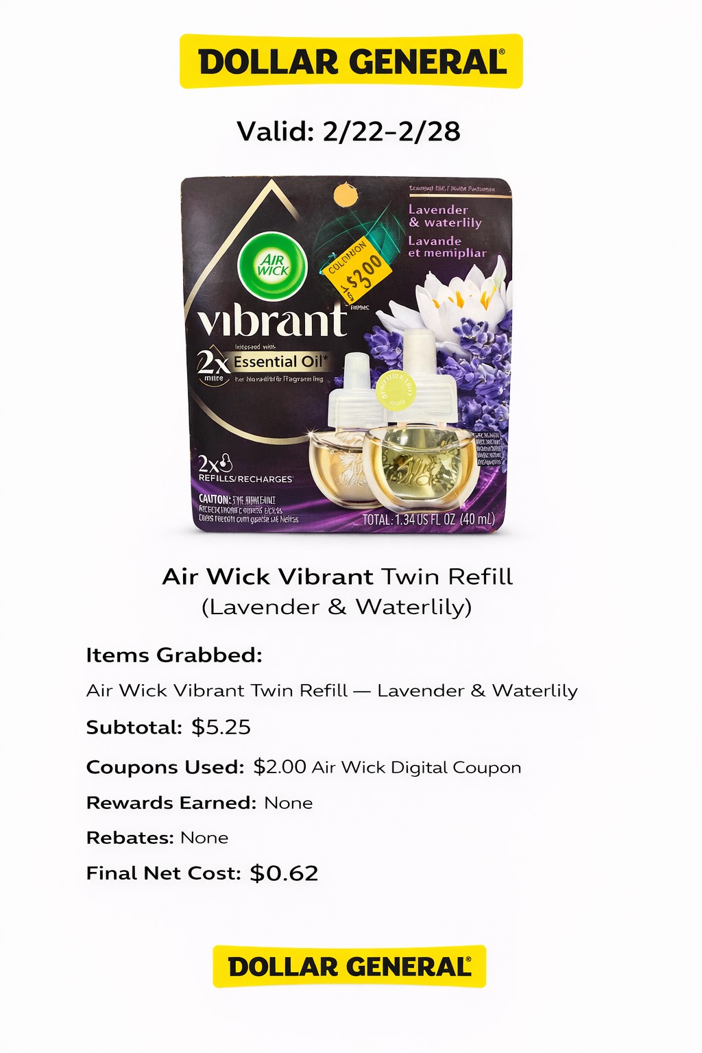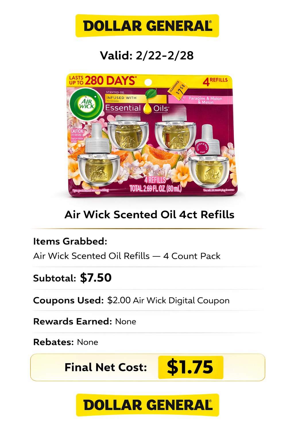 - Coupons Used: $2.00 Air Wick DG Digital Coupon