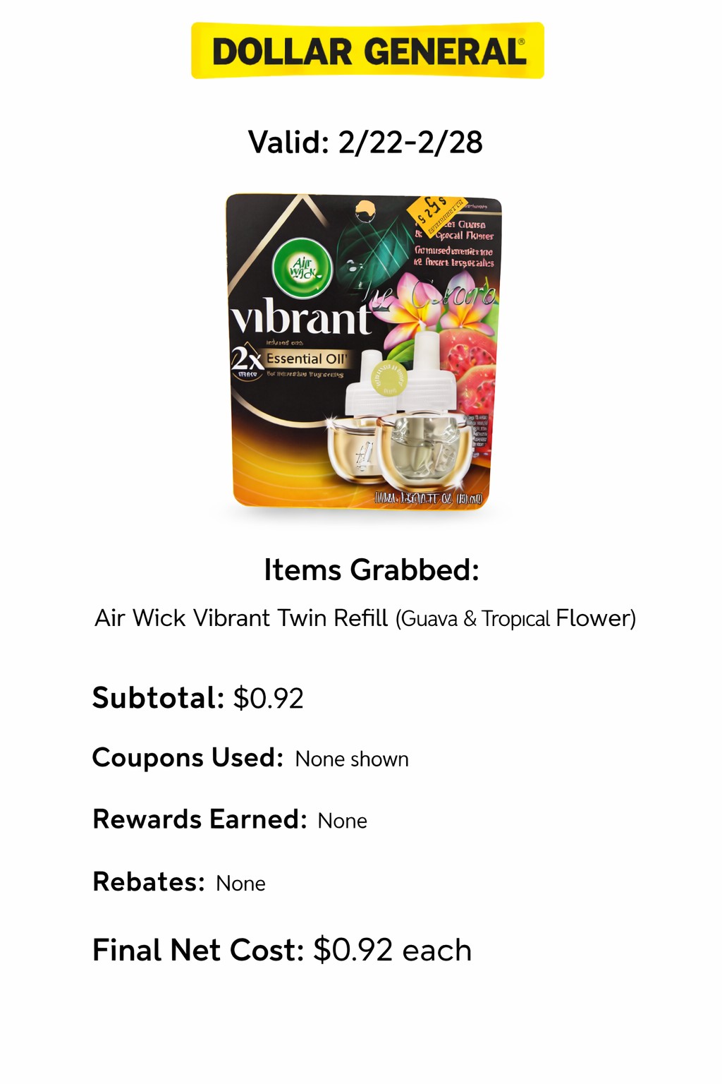 - Items Grabbed: Air Wick Vibrant Twin Refill (Guava & Tropical Flower)