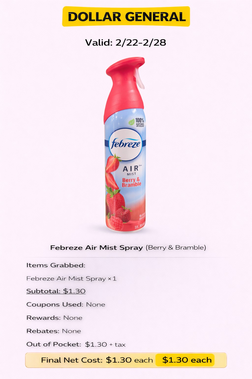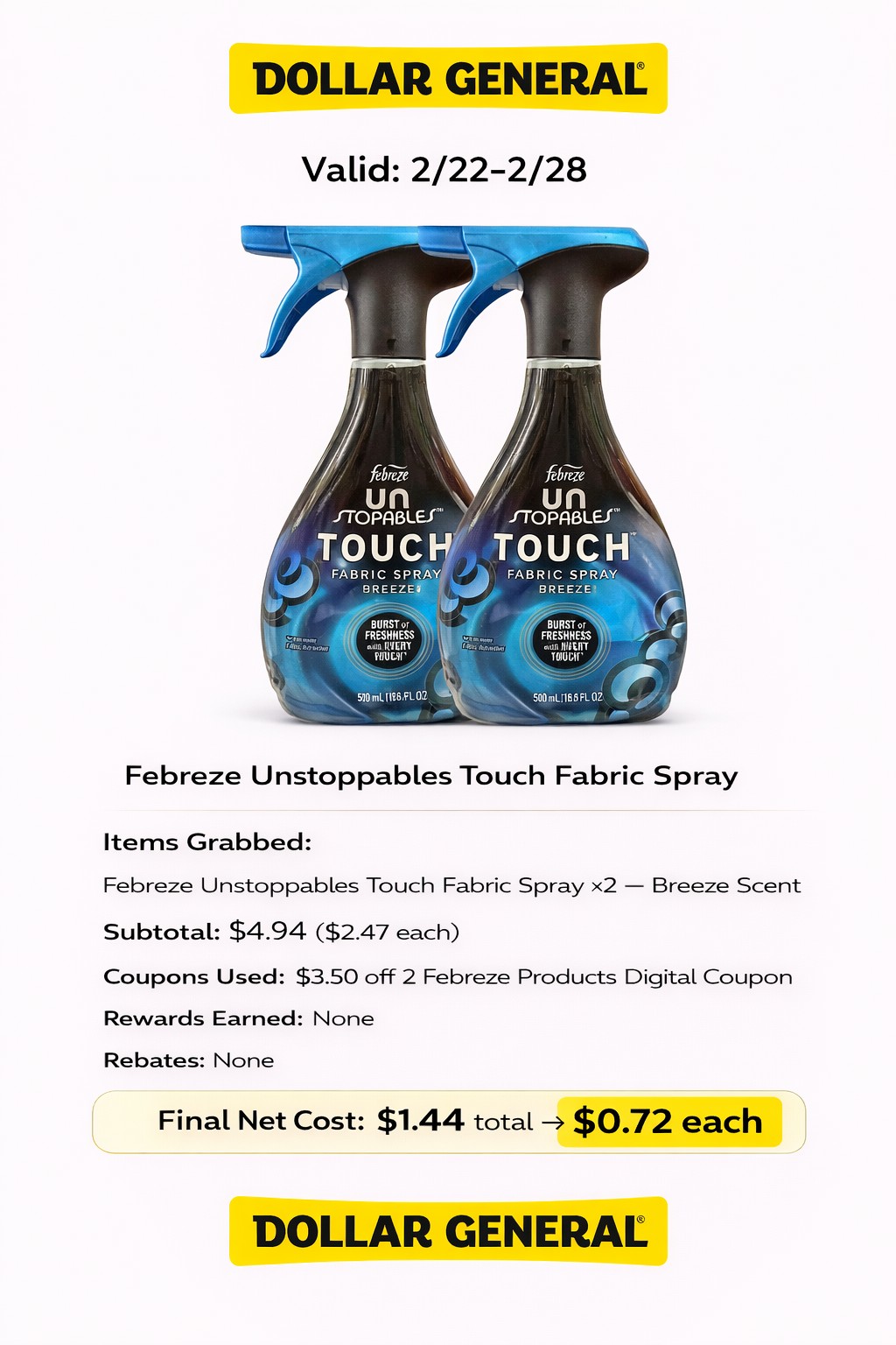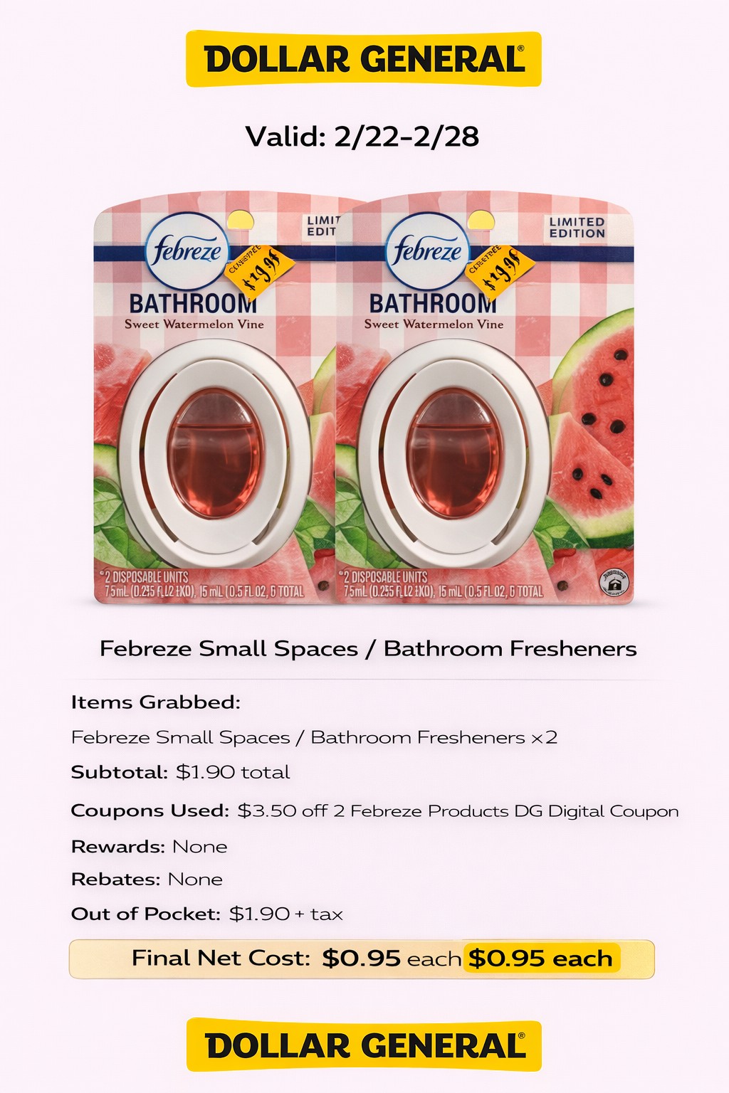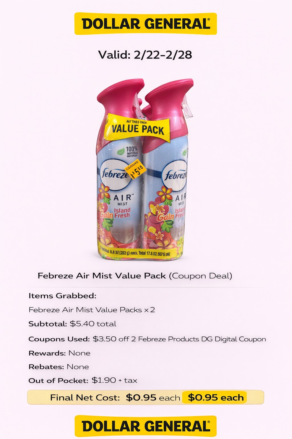 - Coupons Used: $3.50 off 2 Febreze Products DG Digital Coupon