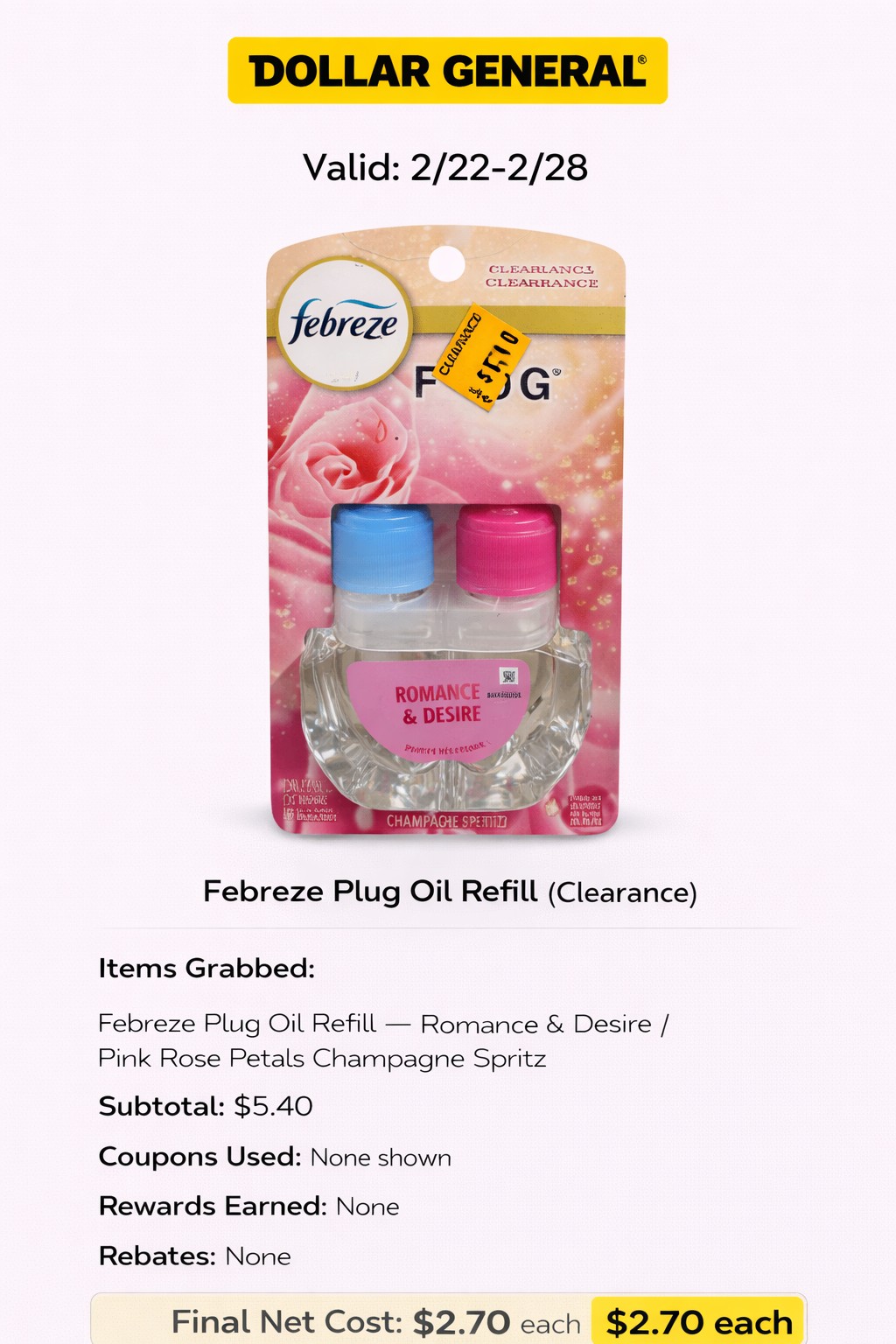 - Items Grabbed: Febreze Plug Oil Refill — Romance & Desire / Pink Rose Petals Champagne Spritz