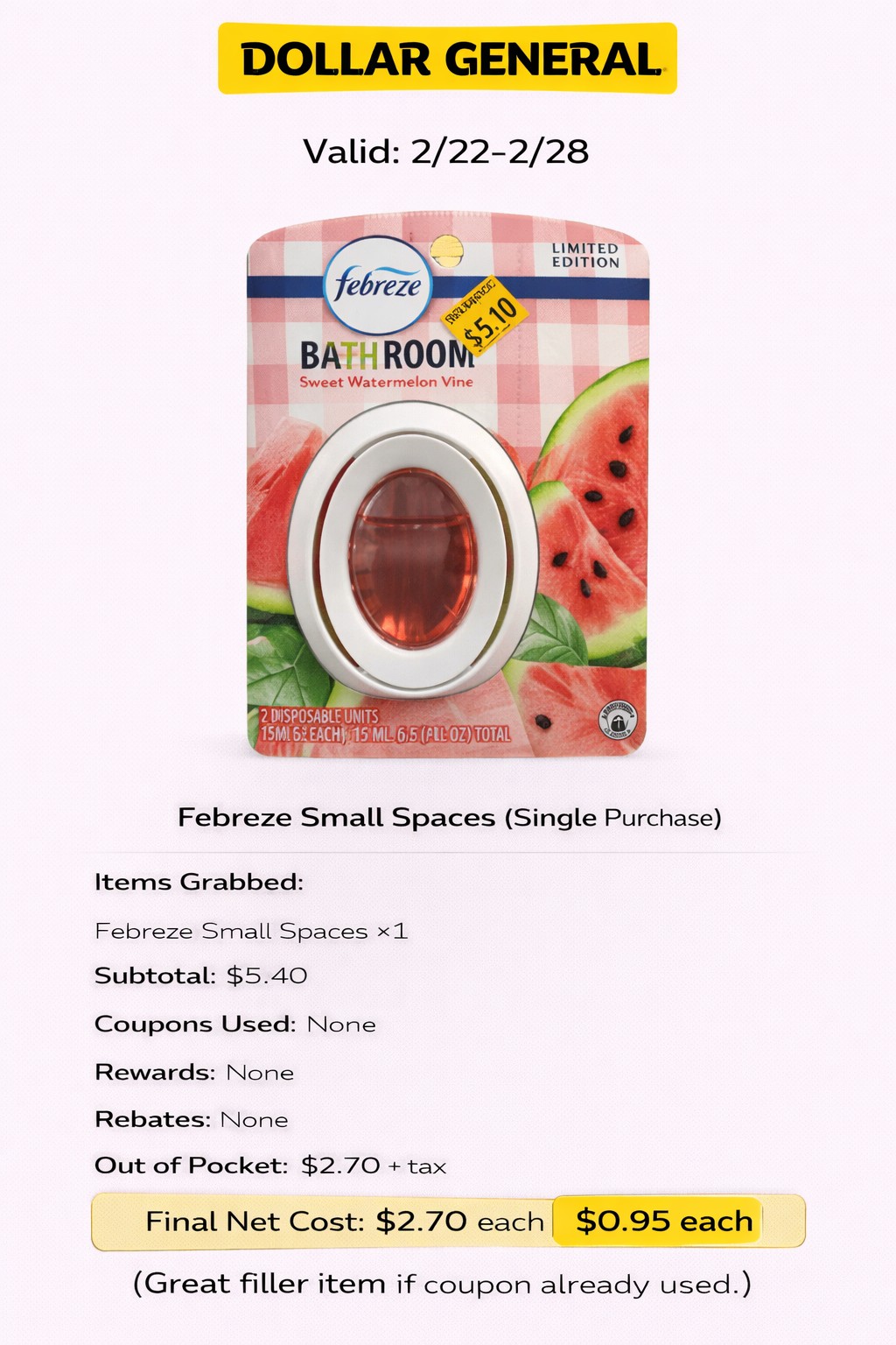 - Items grabbed: Febreze Small Spaces / Bathroom Fresheners ×2