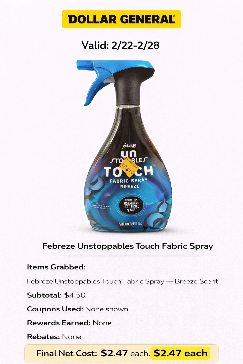 - Items Grabbed: Febreze Unstoppables Touch Fabric Spray ×2 — Breeze Scent