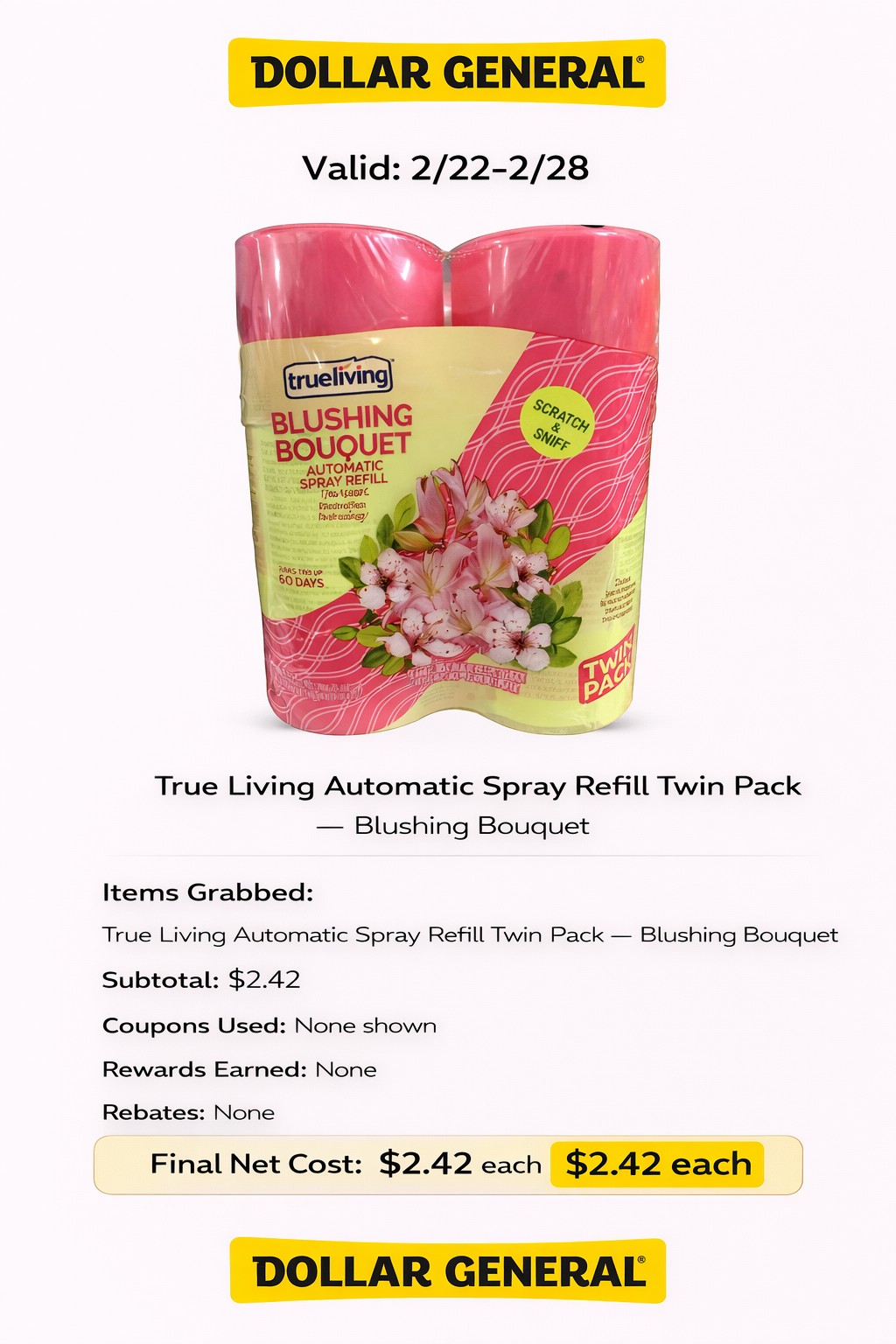 - Items Grabbed: True Living Automatic Spray Refill Twin Pack — Blushing Bouquet