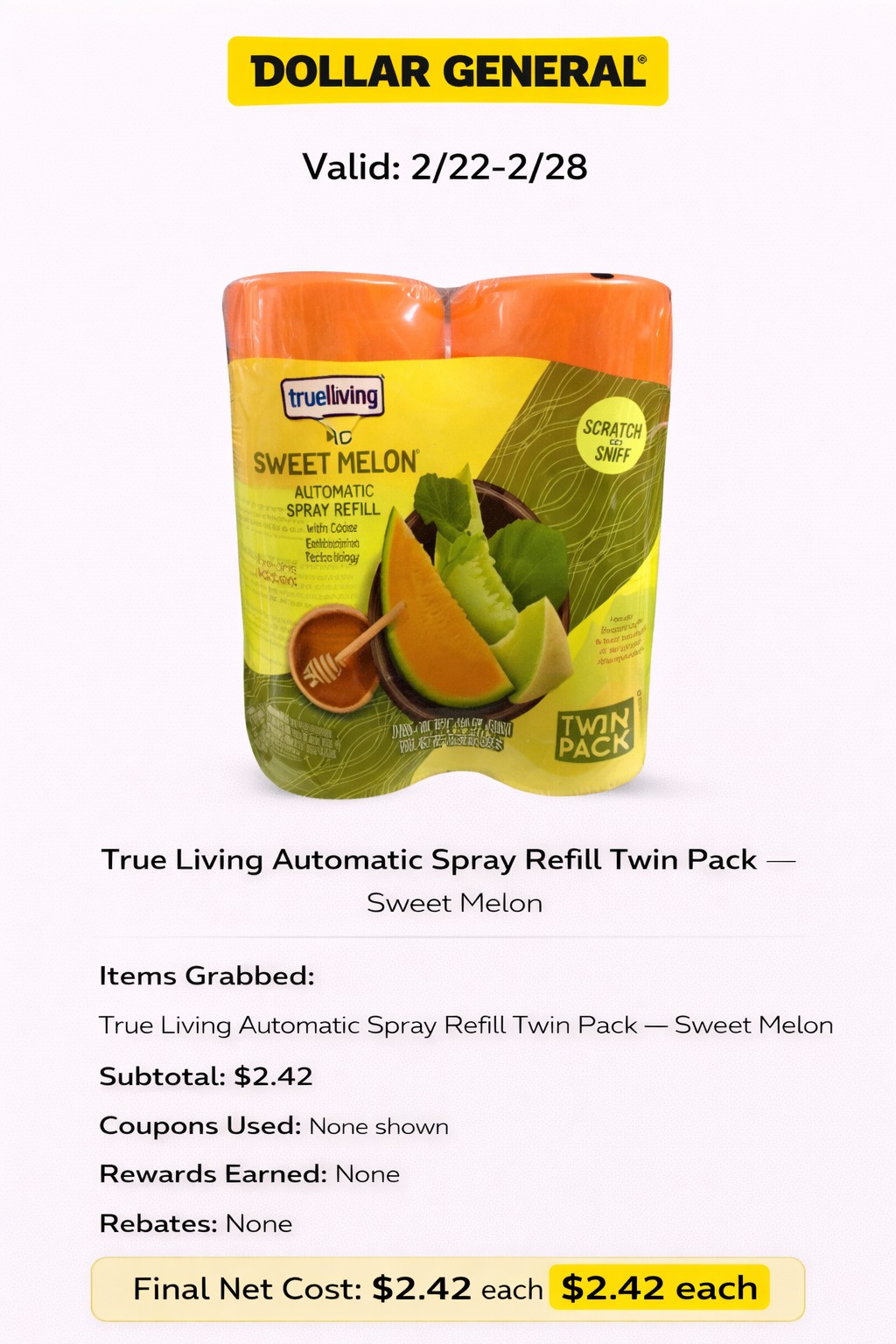 - Items Grabbed: True Living Automatic Spray Refill Twin Pack — Sweet Melon