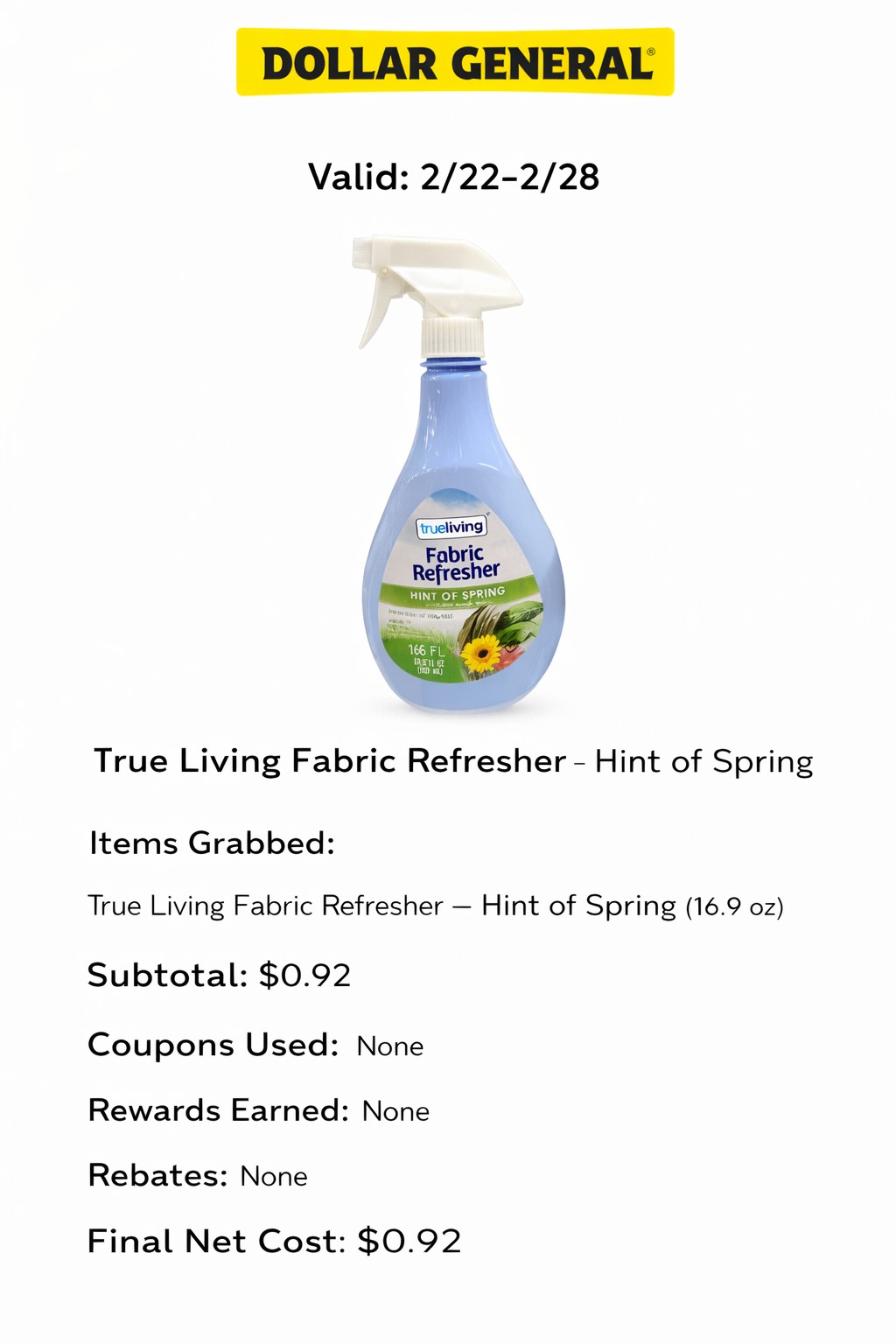 - Items Grabbed: True Living Fabric Refresher — Hint of Spring (16.9 oz)