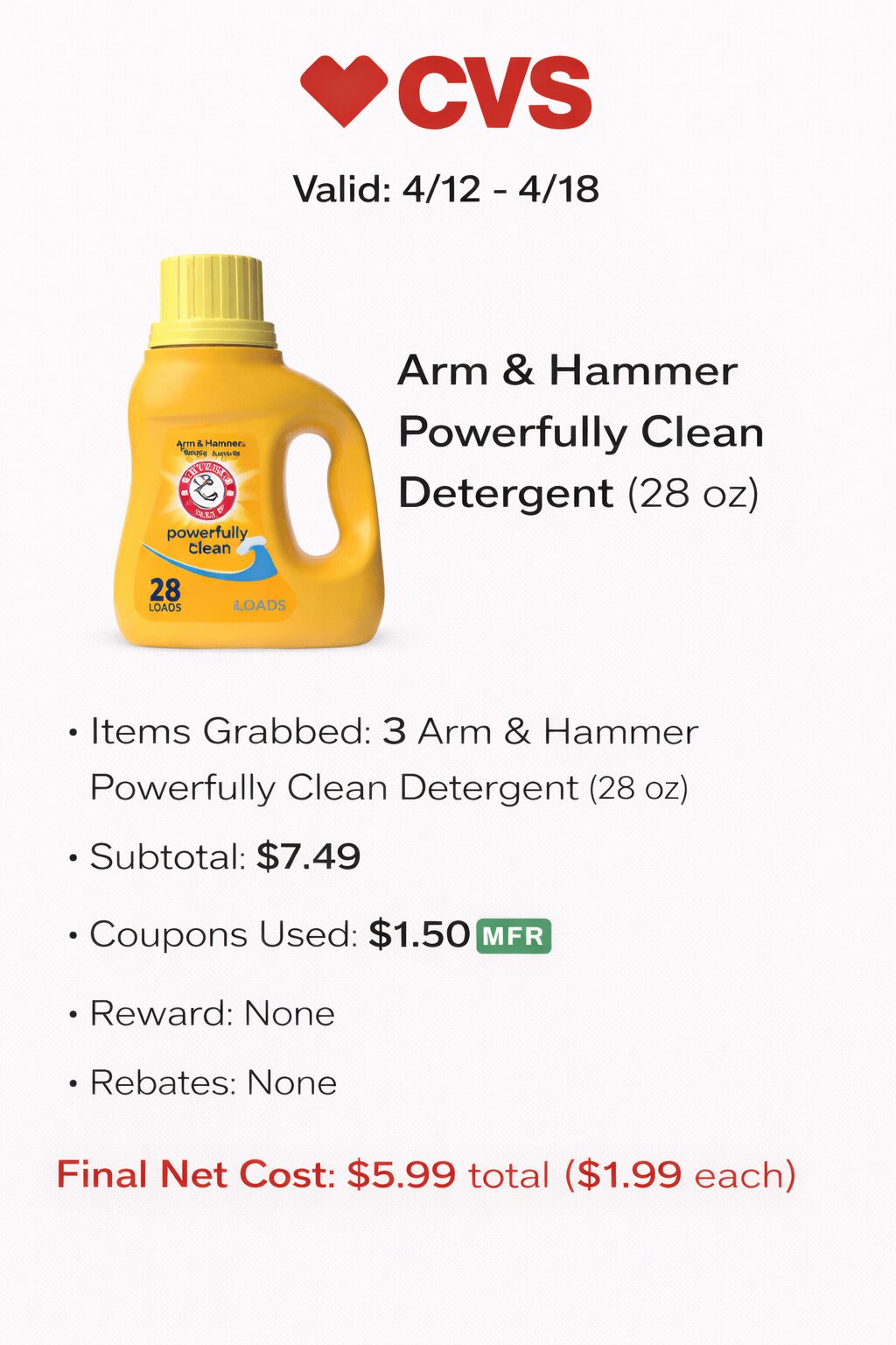 - Items Grabbed: 3 Arm & Hammer Powerfully Clean Detergent (28 oz)