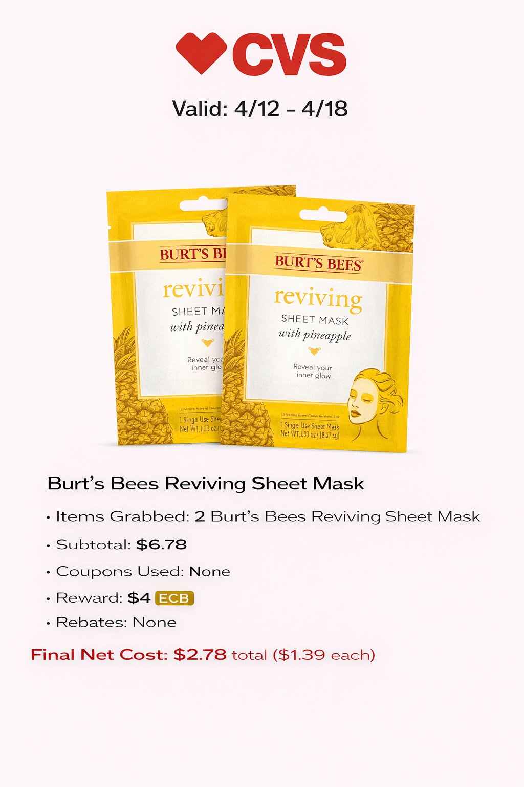 - Items Grabbed: 2 Burt’s Bees Reviving Sheet Mask