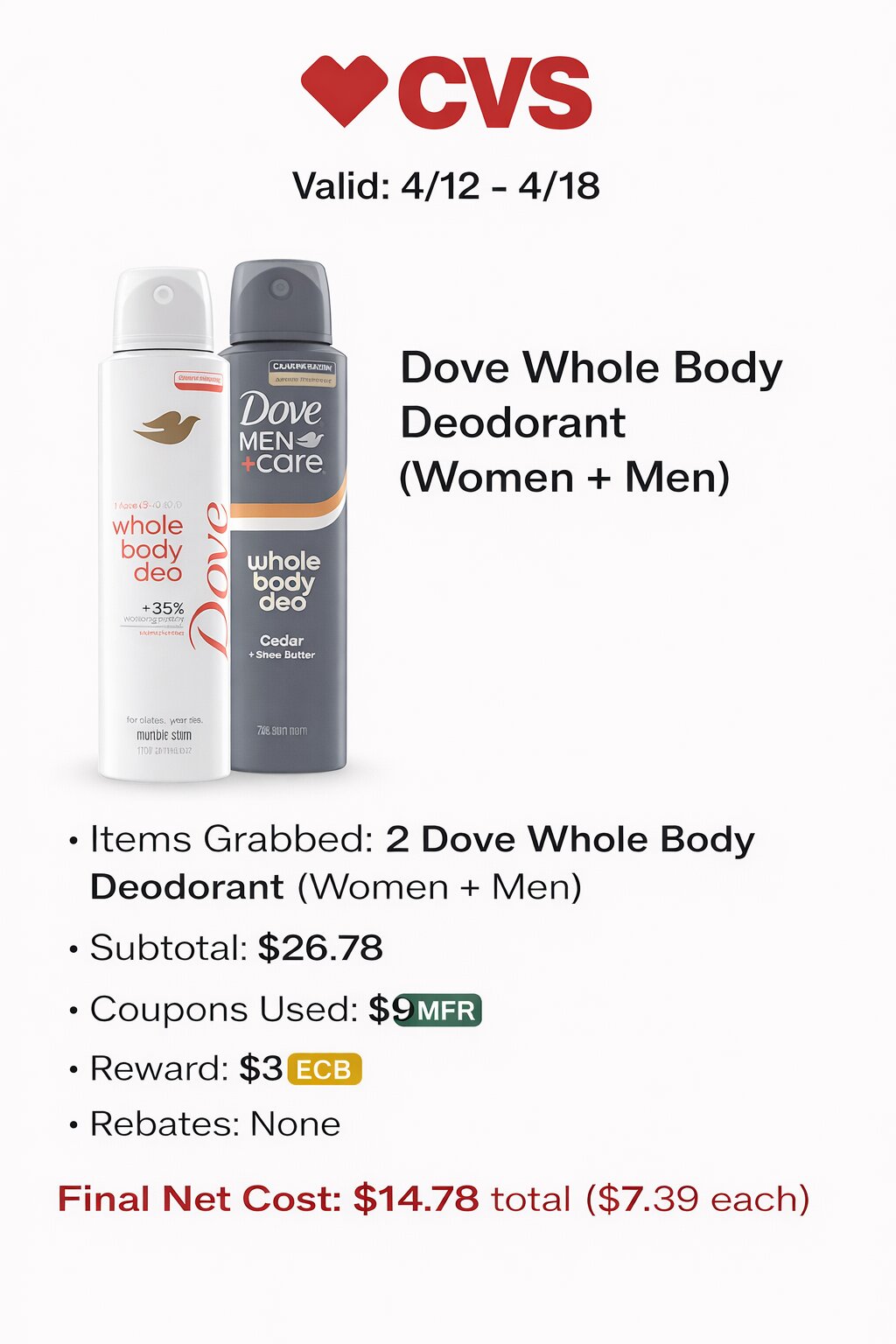 - Items Grabbed: 2 Dove Whole Body Deodorant (Women + Men)
