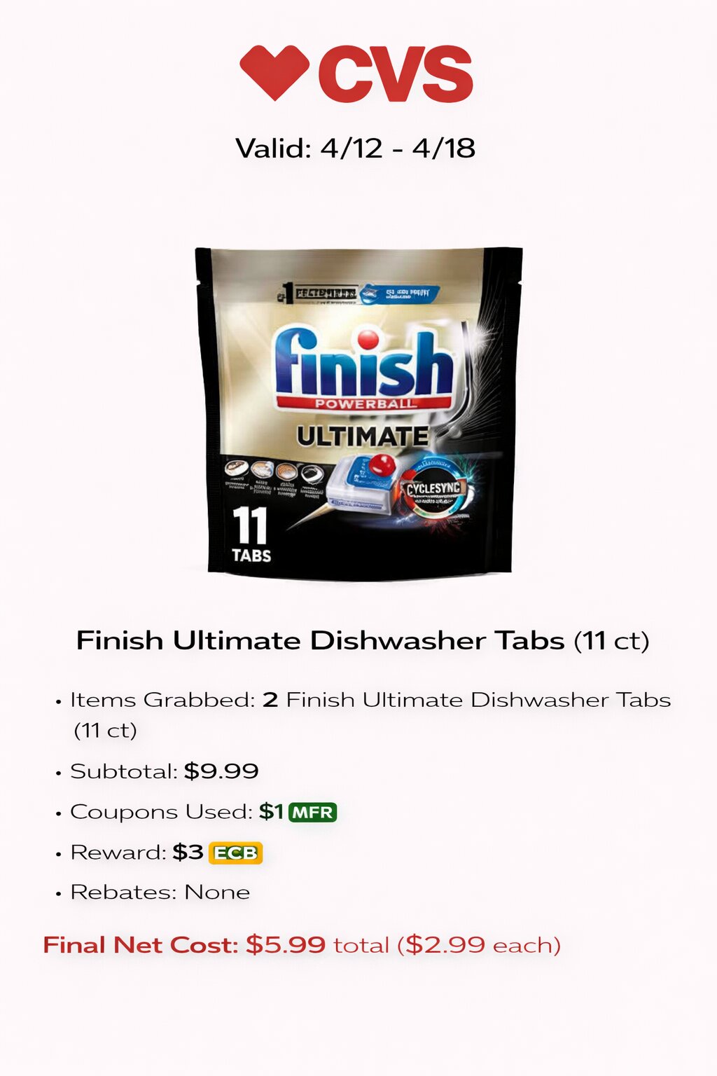 - Items Grabbed: 2 Finish Ultimate Dishwasher Tabs (11 ct)