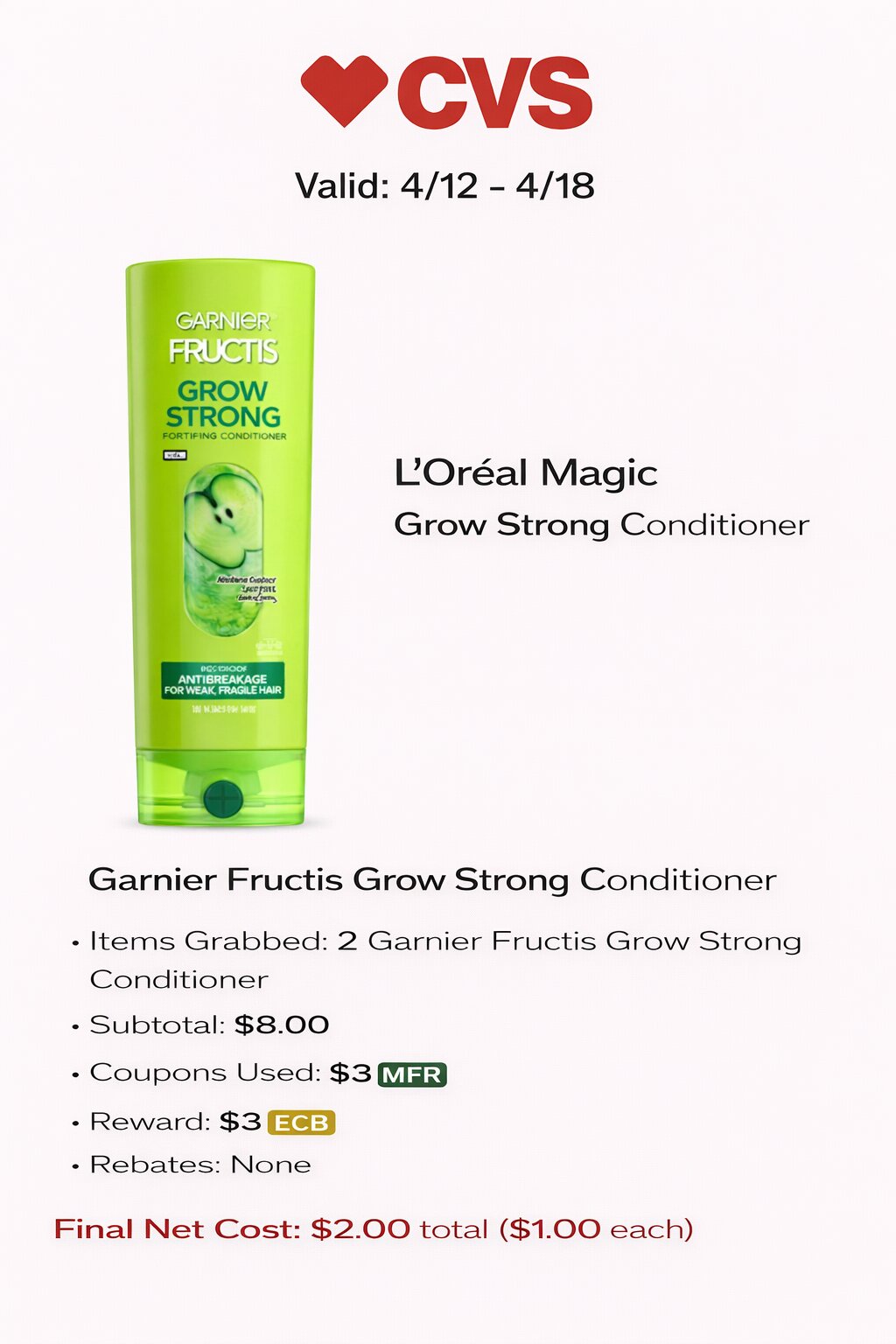- Items Grabbed: 2 Garnier Fructis Grow Strong Conditioner