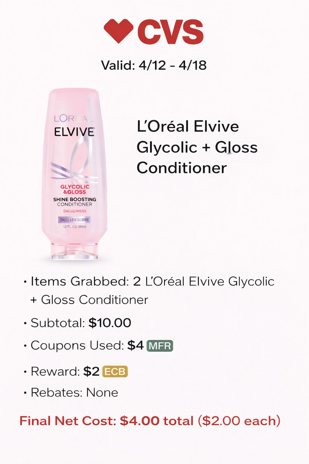 - Items Grabbed: 2 L’Oréal Elvive Glycolic + Gloss Conditioner