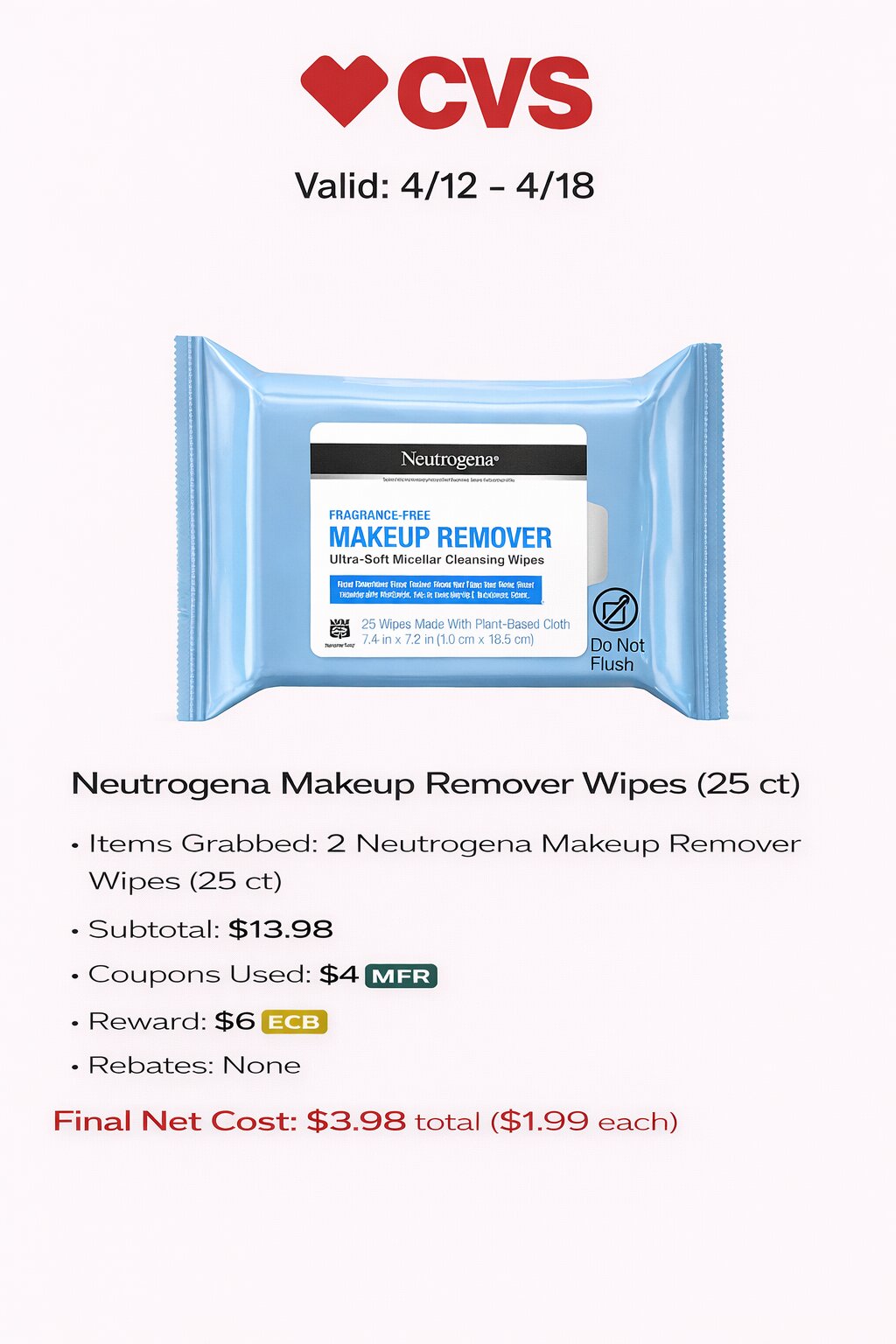 - Final Net Cost: $3.98 total ($1.99 each)