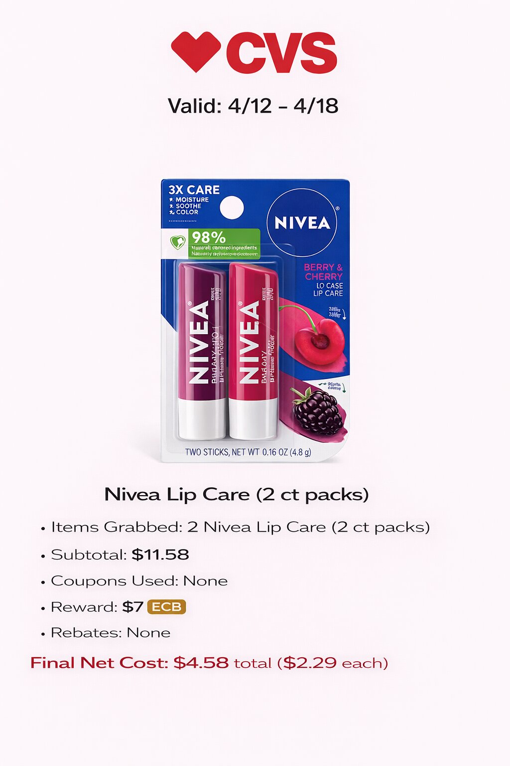 - Items Grabbed: 2 Nivea Lip Care (2 ct packs)