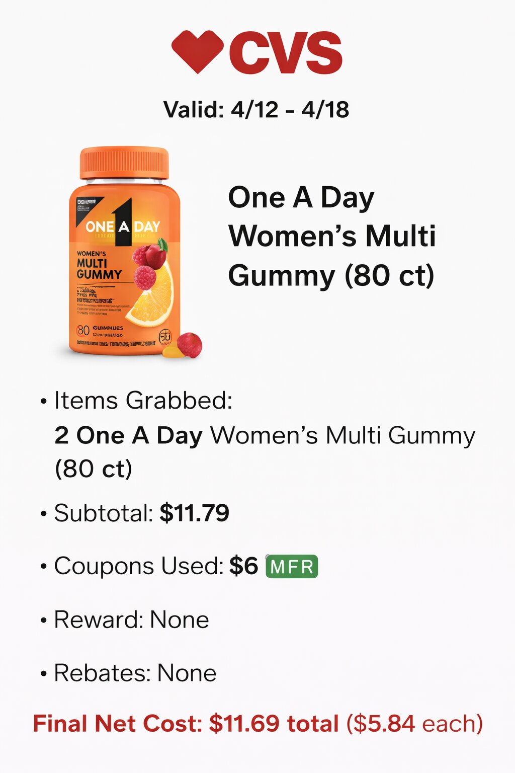 - Items Grabbed: 2 One A Day Women’s Multi Gummy (80 ct)