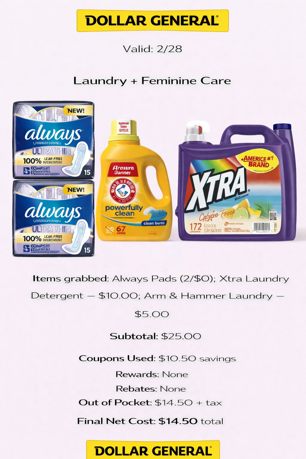 - Items grabbed: Always Pads (2/$10); Xtra Laundry Detergent — $10.00; Arm & Hammer Laundry — $5.00