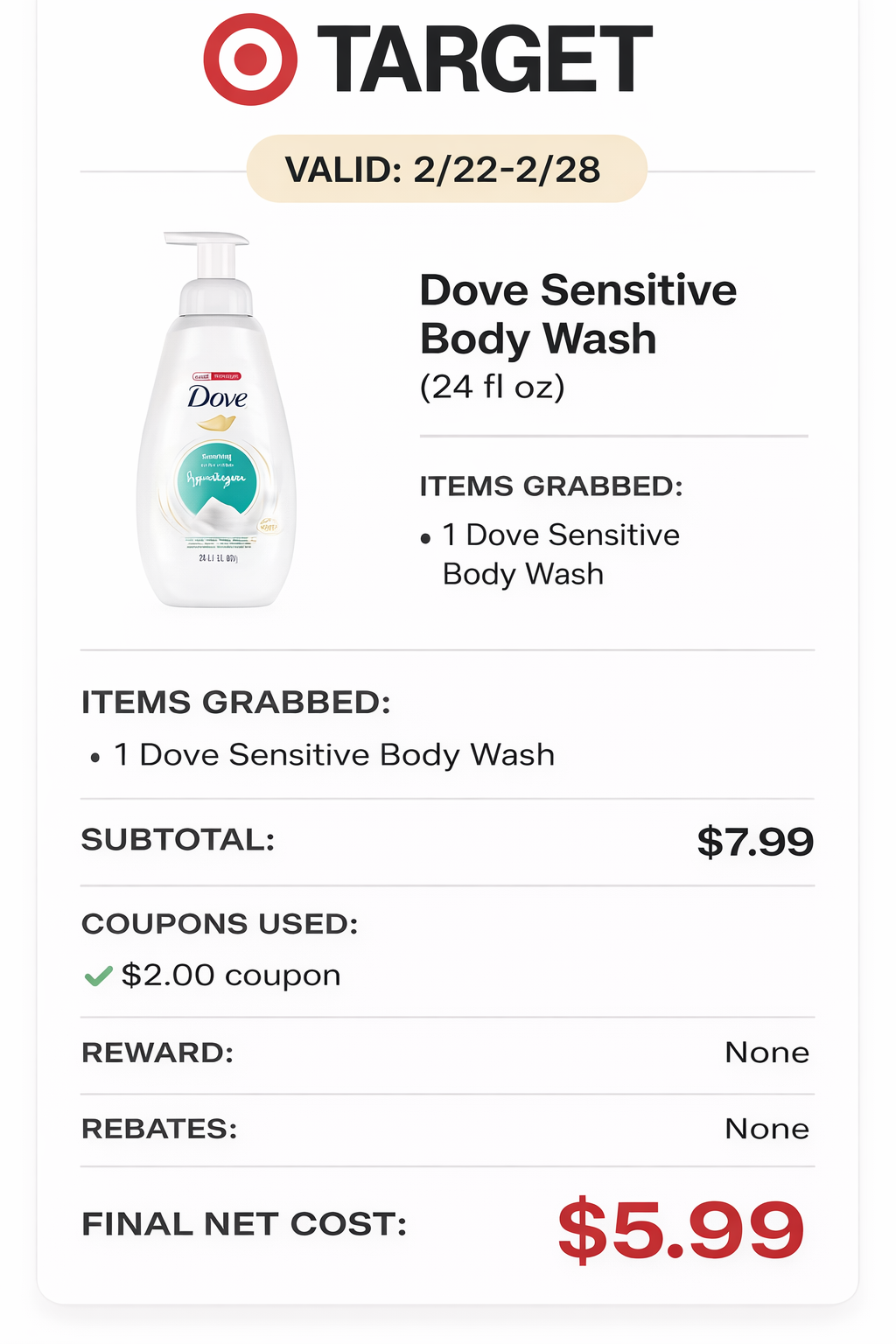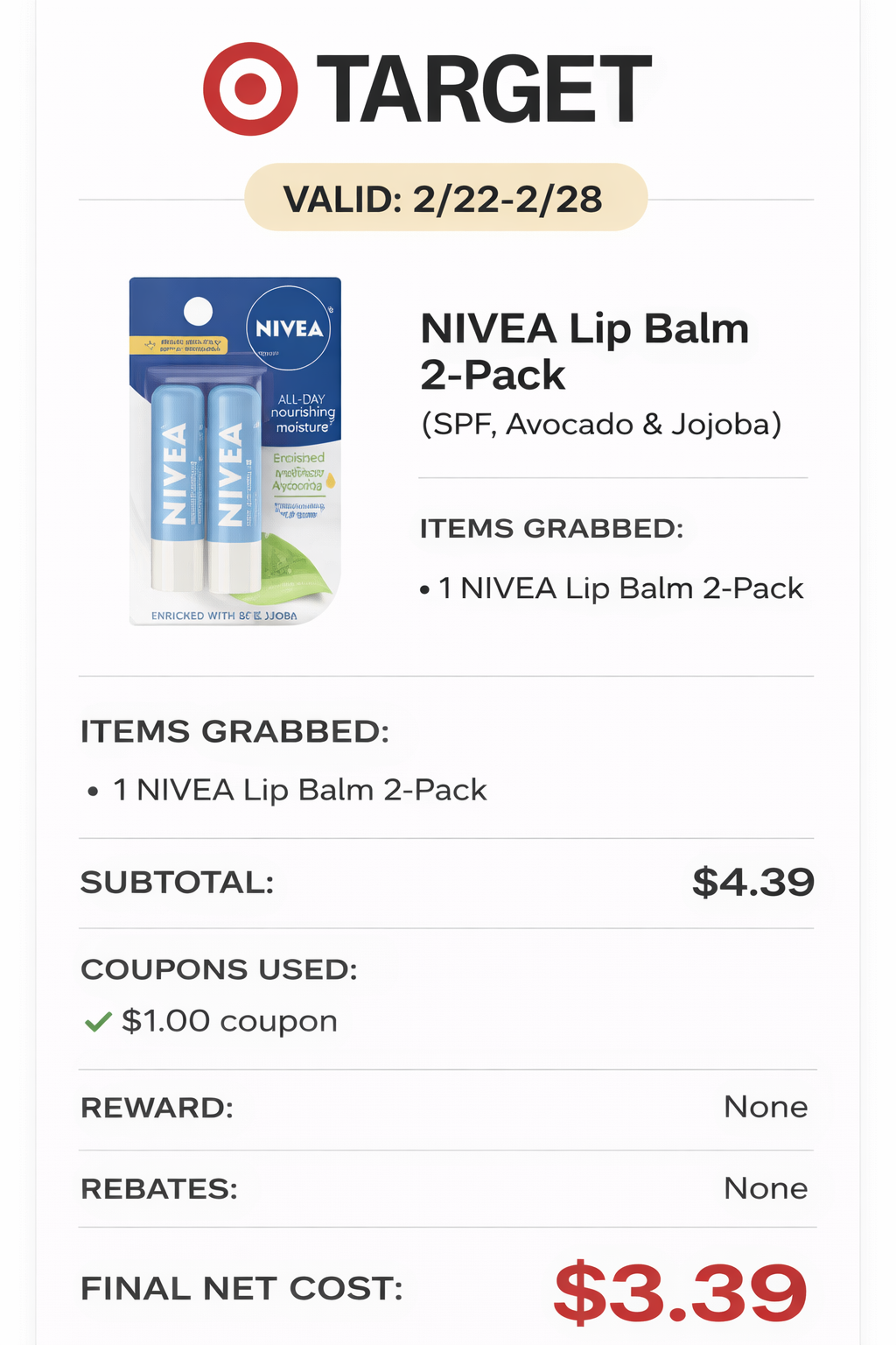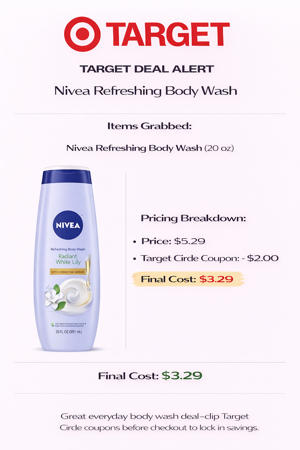 - Items Grabbed: Nivea Refreshing Body Wash (20 oz)