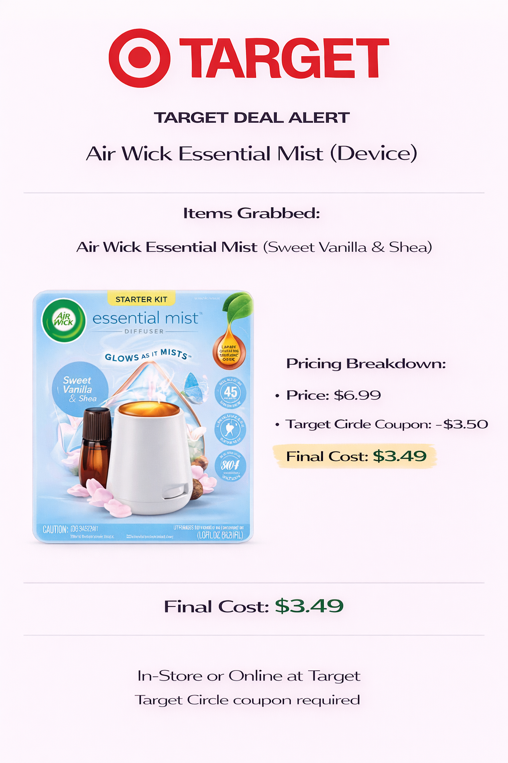 - Items Grabbed: Air Wick Essential Mist (Sweet Vanilla & Shea)