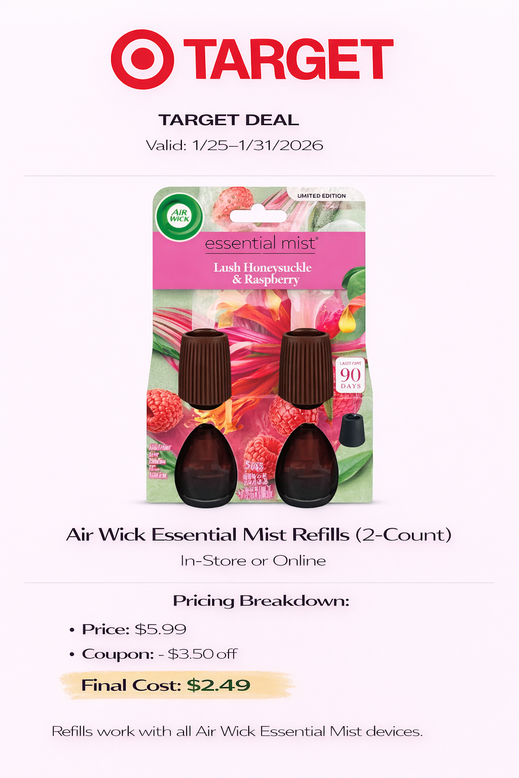 - Items Grabbed: Air Wick Essential Mist Refills (2 ct)