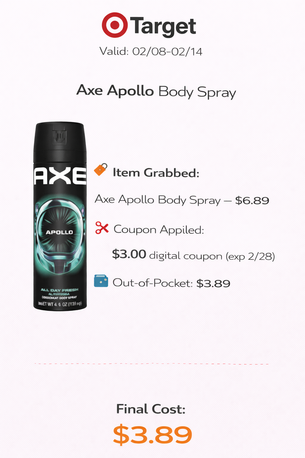 - Item Grabbed: Axe Apollo Body Spray — $6.89